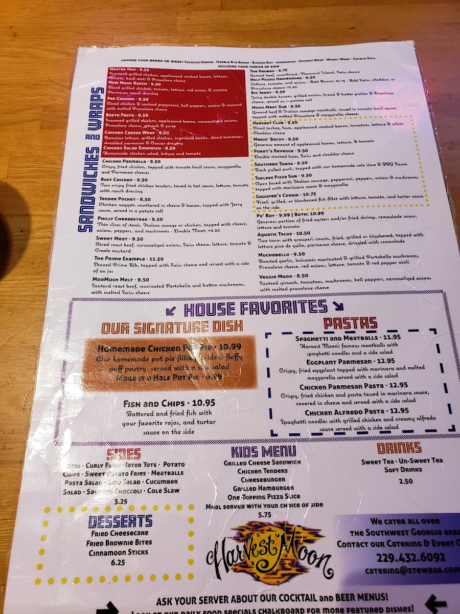 Welcome to Harvest Moon, a culinary gem located in Albany, GA. This delightful eatery is known for its inviting atmosphere and exceptional service. The star of the menu features comforting classics, including the Shrimp Basket, a generous portion of fried shrimp paired with tangy cocktail sauce for just $18.60, and the warm Homemade Chicken Pot Pie, nestled in a flaky puff pastry, starting at $16.80.